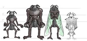They have dark brown chitinous body with a huge abdomen, rounded backs, bipedal legs, four arms, rounded feet, two feelers on top of their heads, two long pincers coming out of there mouth and black bulbous eyes which are multi-faceted like those of an insect. Their shells are as tough as any leather armor.