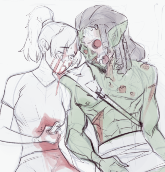 The Goblin Chieftain destroys the front door and pursues Erin. Erin flees to the kitchen, where the pot she's prepared is. The Chieftain breaks through the door, and Erin manages to get two hits on the Chieftain, while the Chieftain stabs Erin in the stomach. Erin throws the burning oil onto the Chieftain's chest, causing him to scream and begin smoking and dying. They both collapse, and Erin levels.