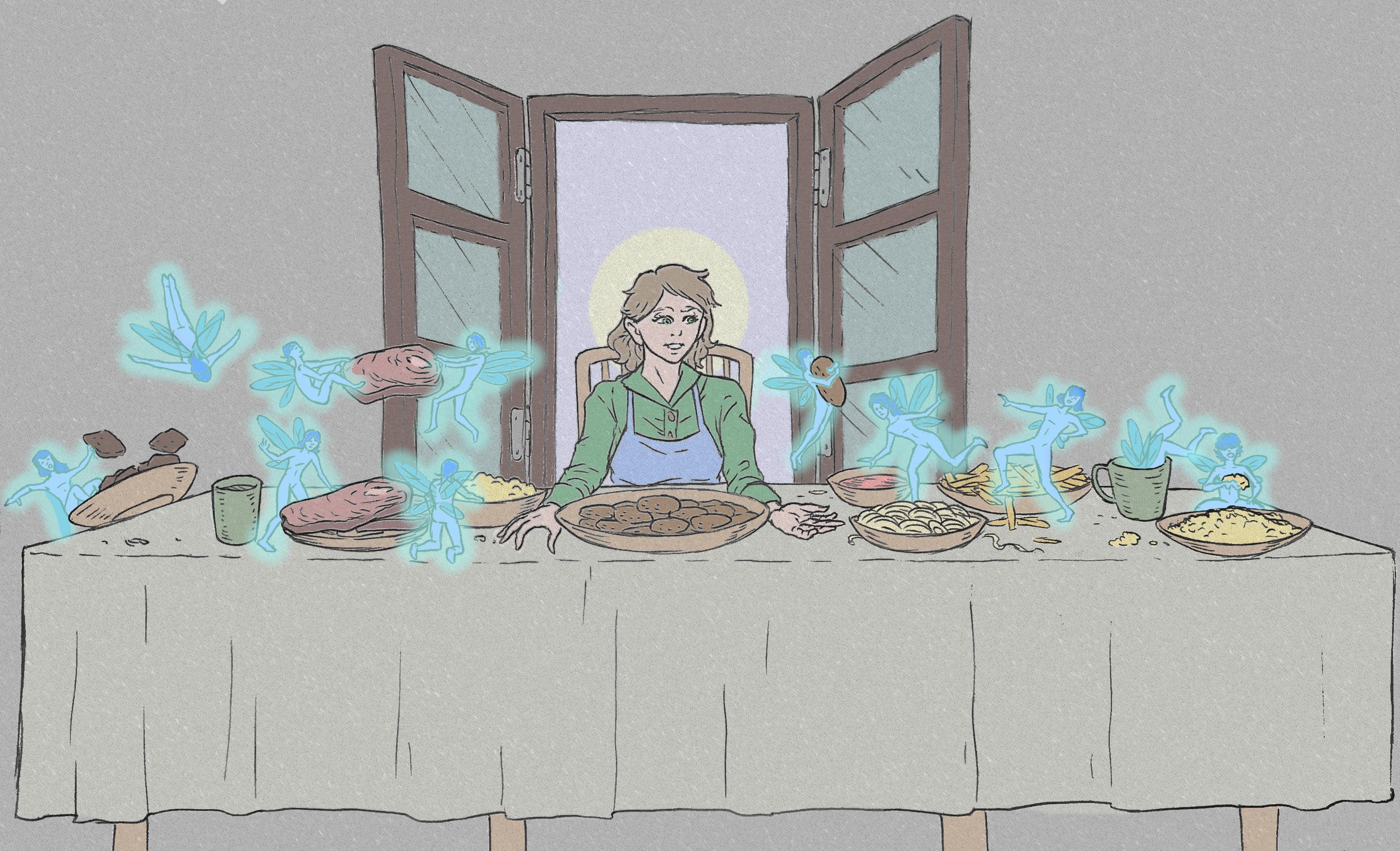 Being a virgin herself, Erin processes the milk, makes some bread, and mixes more sugar that she bought with fresh fallen snow that she then places in moonlight. Finally, Erin invites the Frost Faeries for the banquet that she prepared in good faith, and they appear for the feast. Erin agrees to be paid with a heap of gold that the faeries conjure, only to realize in the morning that she has been paid in golden yellow flowers.