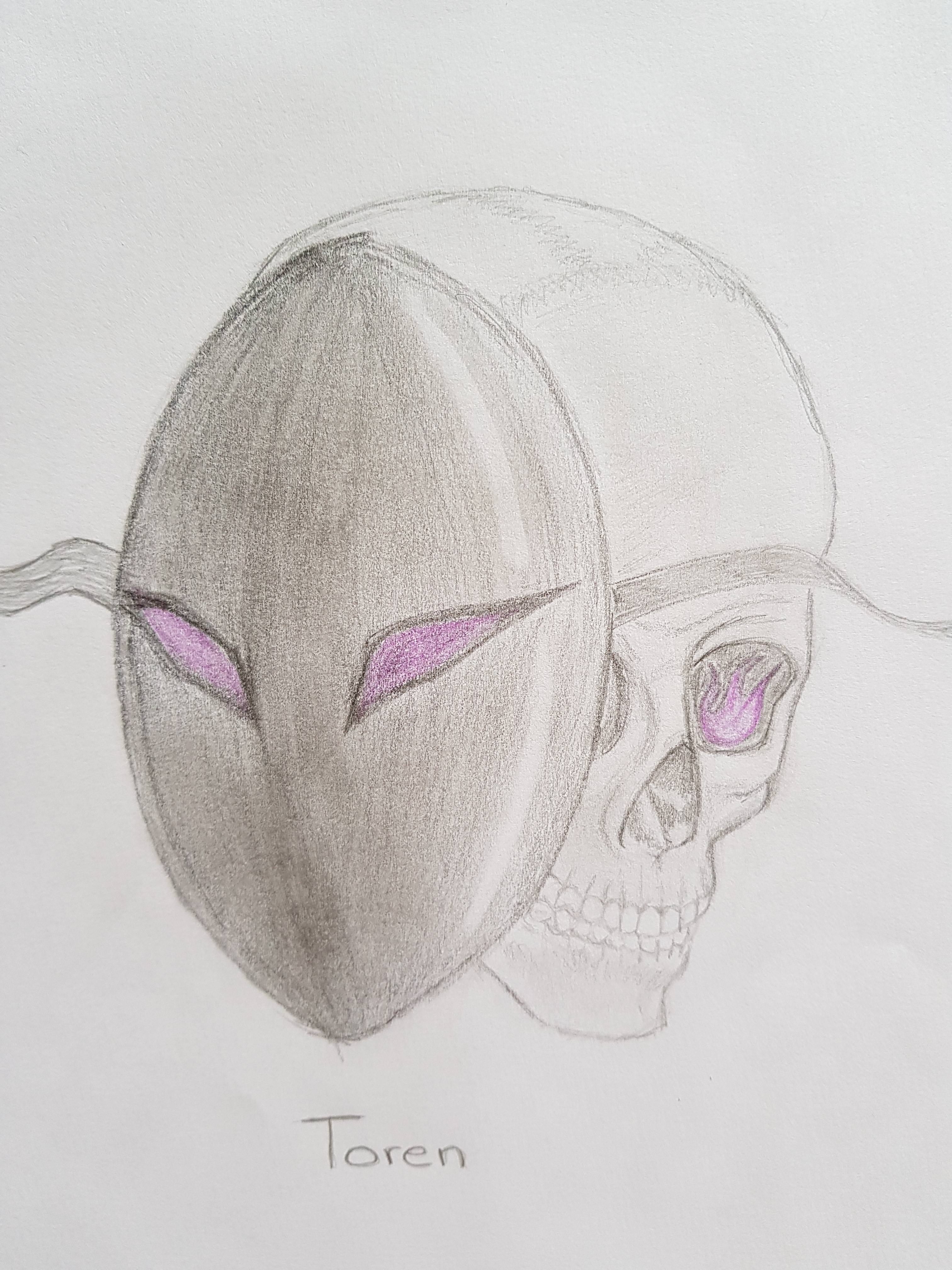 - Toren discovers a dead adventurer with a cloak. He takes it from her and wears it, but after checking himself in a piece of broken mirror he comes to the conclusion that he needs more clothing in order to look good with the cloak. Toren puts on clothes from the other dead adventurers nearby, including a stuffed bra before fashioning a mask from the carapace of a Shield Spider. When he looks back in the mirror he sees a slim female figure with glowing eyes - but Toren manages to dim the flames in his skull entirely. With that done Toren feels like she could like any other human underneath it all.