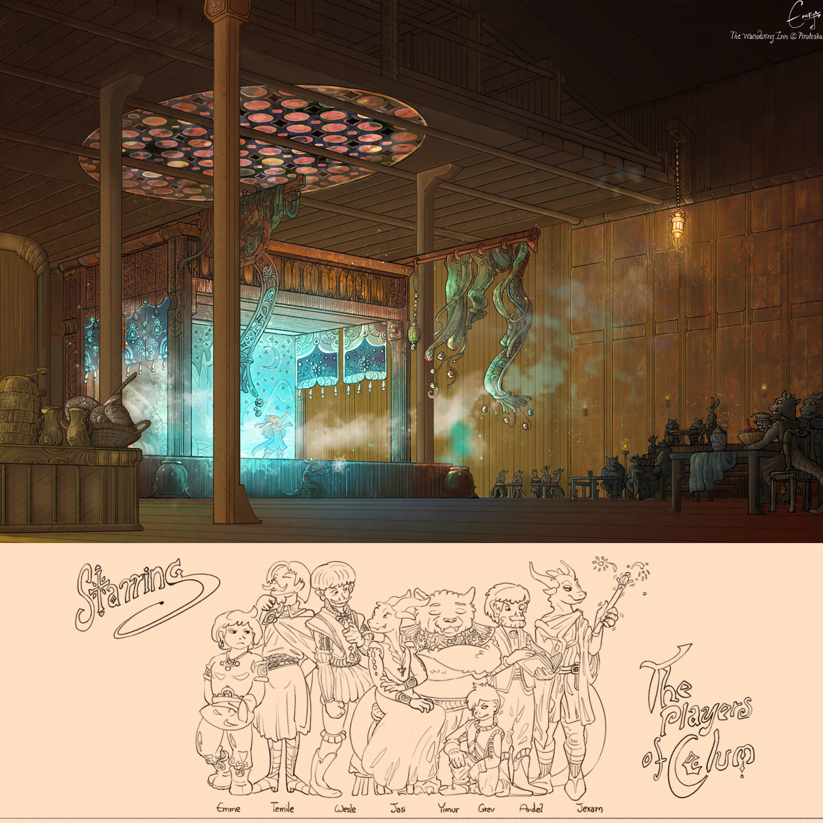 - Erin in Celum: at Octavia’s (extorts inventor’s and magical door fee); organises Players of Cellum to use her inn as theatre, uses Runners’ guild for PR