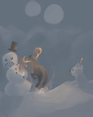 - Toren managed to kill the first Corusdeer he encountered, though only because he had help from a Snow Golem and could reassemble himself after many of his bones had been disentegrated from heat.[9][13] He later slaughtered a small herd of at least ten deer.[14]