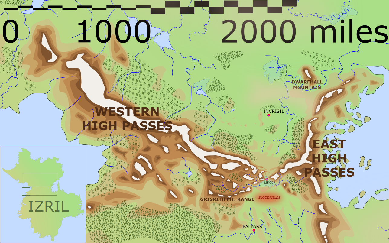 Map of Central Izril, featuring the High Passes. The two metropoles Invrisil and Pallass have been added to the map as well as Liscor.