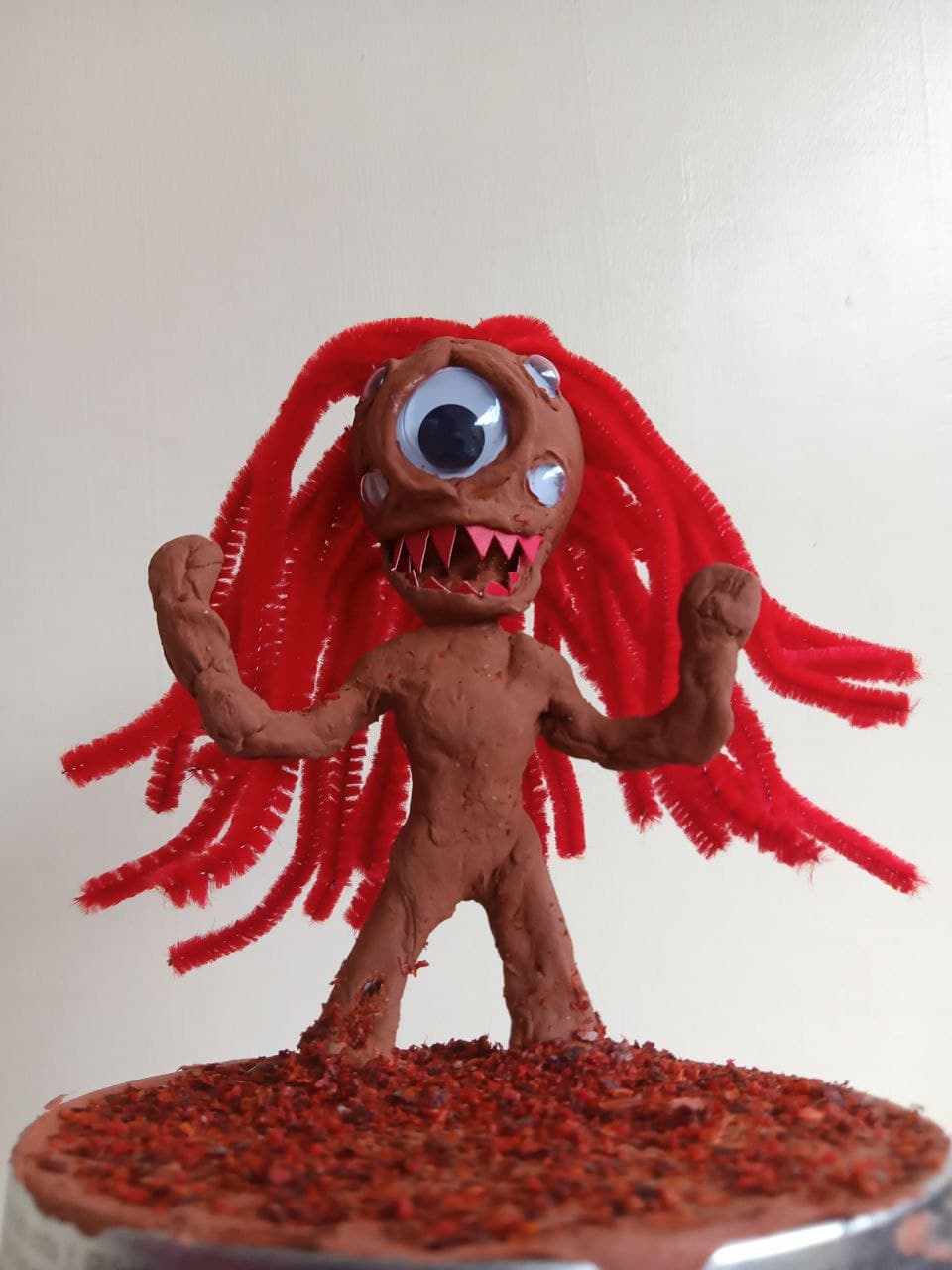 An initial prototype featuring Minizi using air-dry clay, googly eyes, metal wires (skeleton), fuzzy wires (dreadlocks), red folder (teeth), and chili flakes (red "sand"). Made by Nap on 2021-10-20.