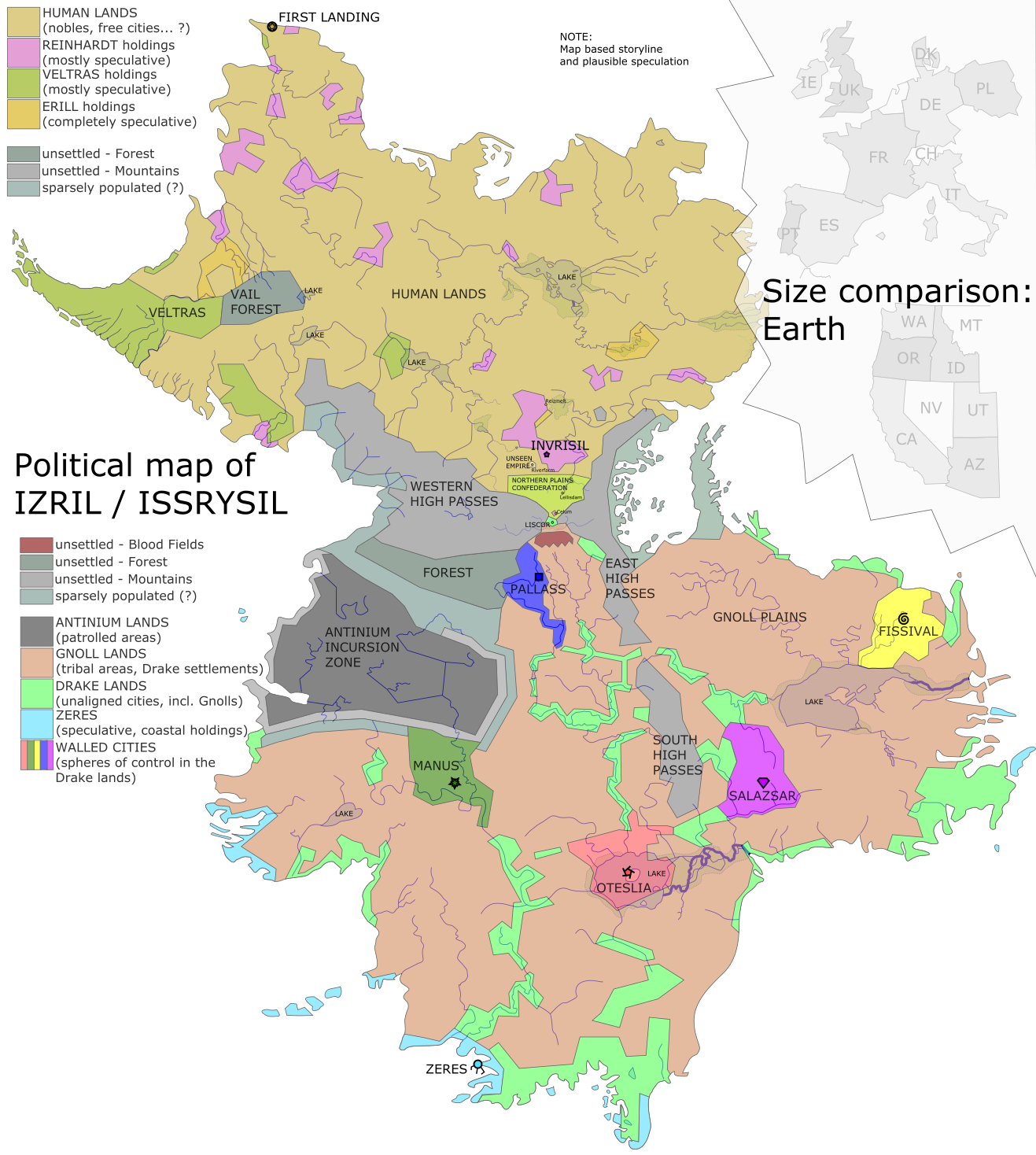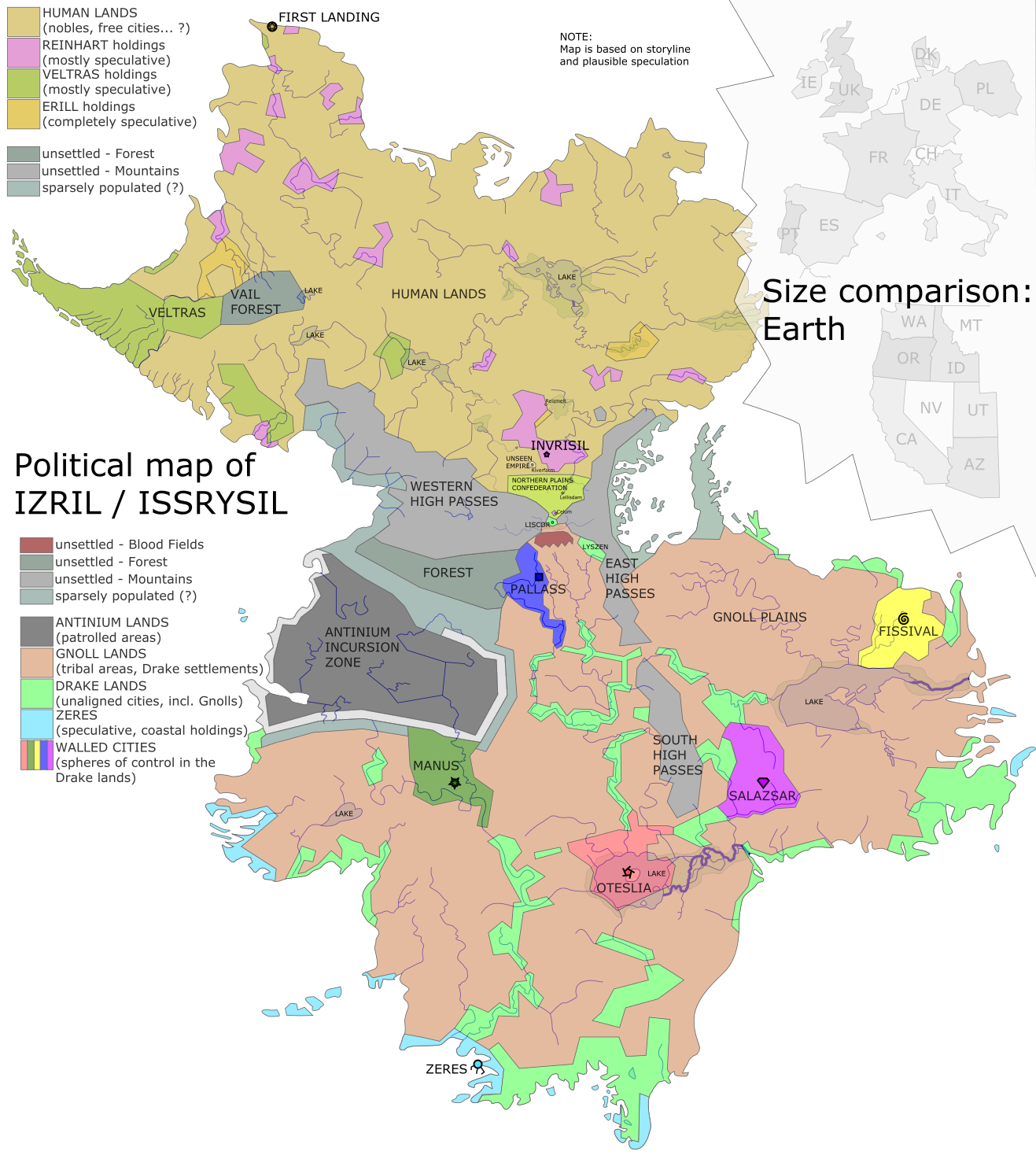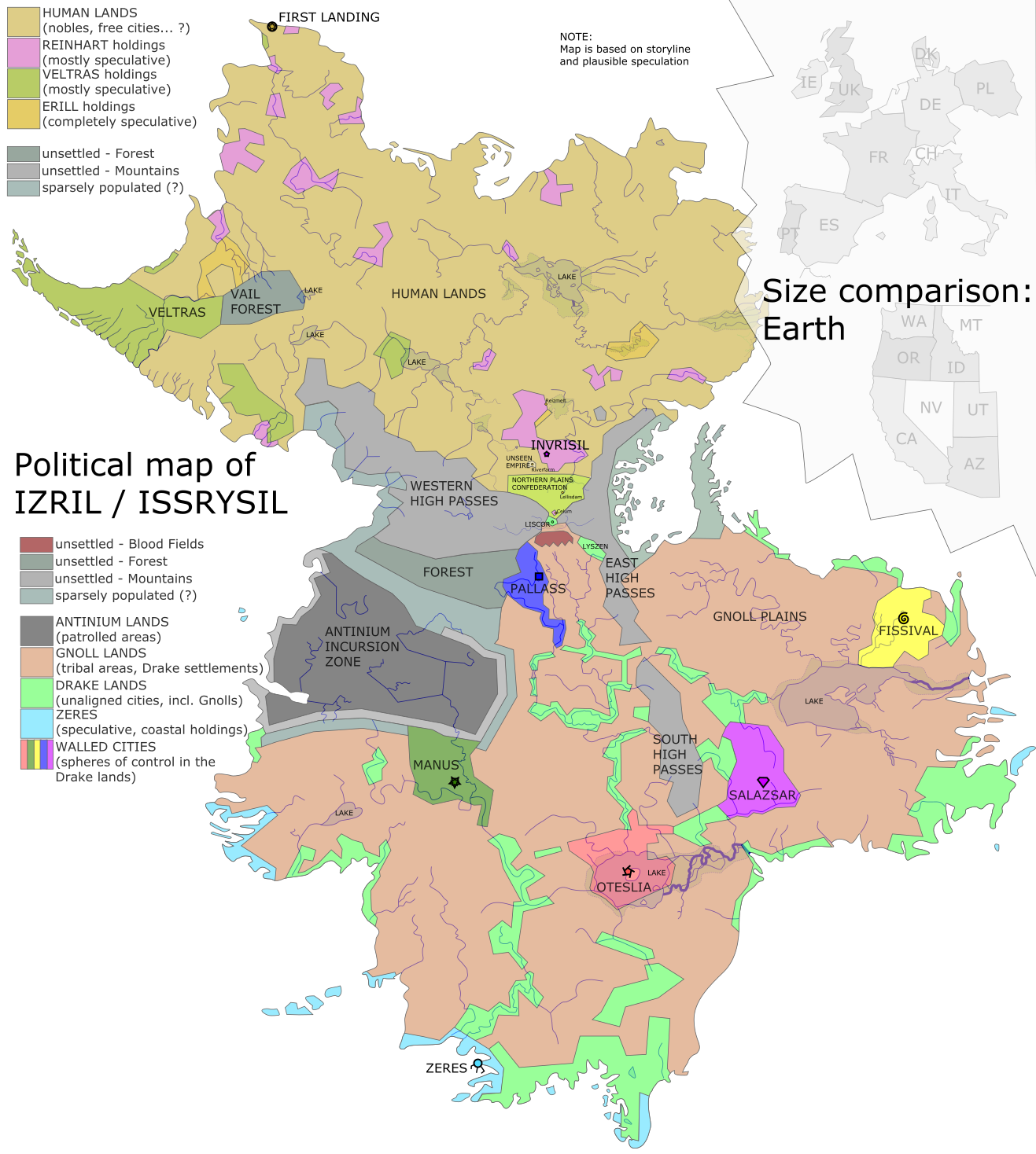 Note that per canon, approximately 80-90% of Izril is unsettled wilderness, but this map here assumes that the wilderness widely around a settled area is "claimed" (the areas that aren't grey).