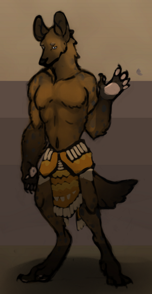 Gnoll hands and feet are exclusively referred to as ‘paws’ in the source material, including by Gnolls themselves.[11] This implies short, stubby digits in lieu of a Human's longer fingers. However, they are said to be reasonably dexterous for what they are.[16] Throughout the story, Gnolls are seen using tools, weapons, musical instruments, and other devices made for Humans or Drakes without any apparent disadvantage. Additionally, Gnolls feature large retractable claws on all four paws,[11] in the typical feline fashion. This is unlike real hyenas, whose claws do not retract.