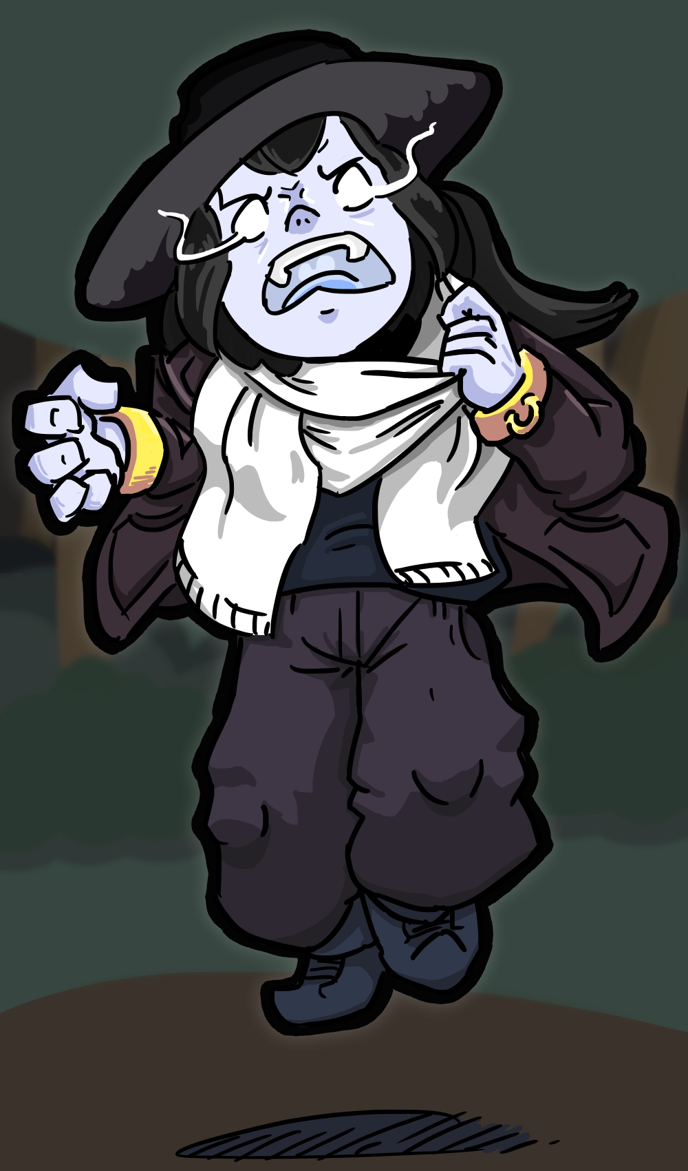 She has only been shown as a large female human in dark clothes, a scarf, and top-hat. Rain does not soak her as normal.[1]