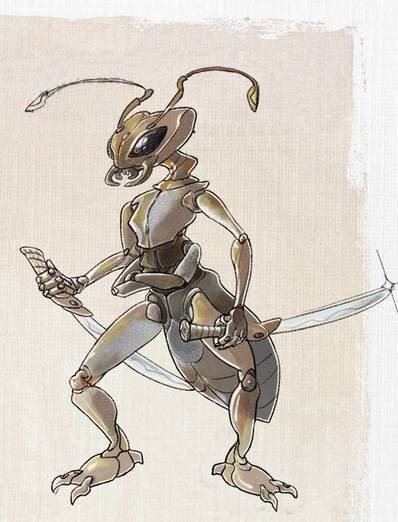 His body was also subject to change depending on the foe and battlefield. One of the many modifications the First Queen applied to him was creating a holding compartment inside his body which could store his two blades. Those could then be mentally activated and - through the use of two gas glands - would eject the swords out instantly, likely in a manner of miliseconds as necessary for fighting the enemies Klbkch would often face. This modification also had a major drawback as it was very easy to stop as if even slight damage happened to any piece then the swords were effectively stuck inside him.