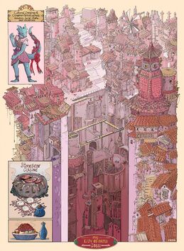The city is also leaning due to an earthquake and a Giant pushing the city once. Due to this, the inhabitants rebuilt around it so they had more of a ramp-wall. Older buildings in the city are shifted diagonally while later-made ones are upright. Loeri has no gates, and must be entered by climbing ropes. They use elevators to import goods, hauled up and lowered down by teams of workers.