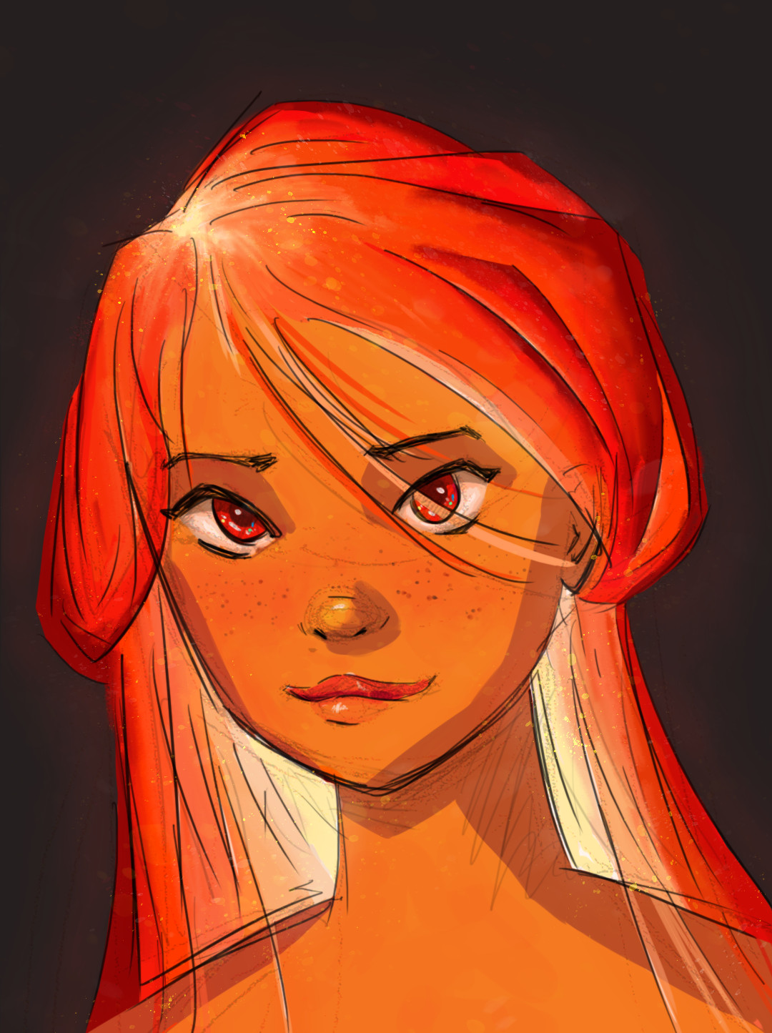 In her youth, she was a beautiful woman, and her hair was jet black, mixed with fiery red and orange. Like embers in the smoke.[1]