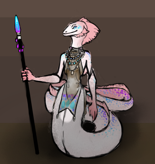 Naili, as a Lamia, is a half-snake, half-humanoid, making her look similar to a Naga. Whereas Nagas are powerfuly built, Naili is rather slim and small in stature. She has light white and rose scales, though across her arms and back a pattern of glowing scales which shifts with bright blues and purples and yellows. Her face, however, resembls more that of the Lizardfolk from which she had evolved from.[1]