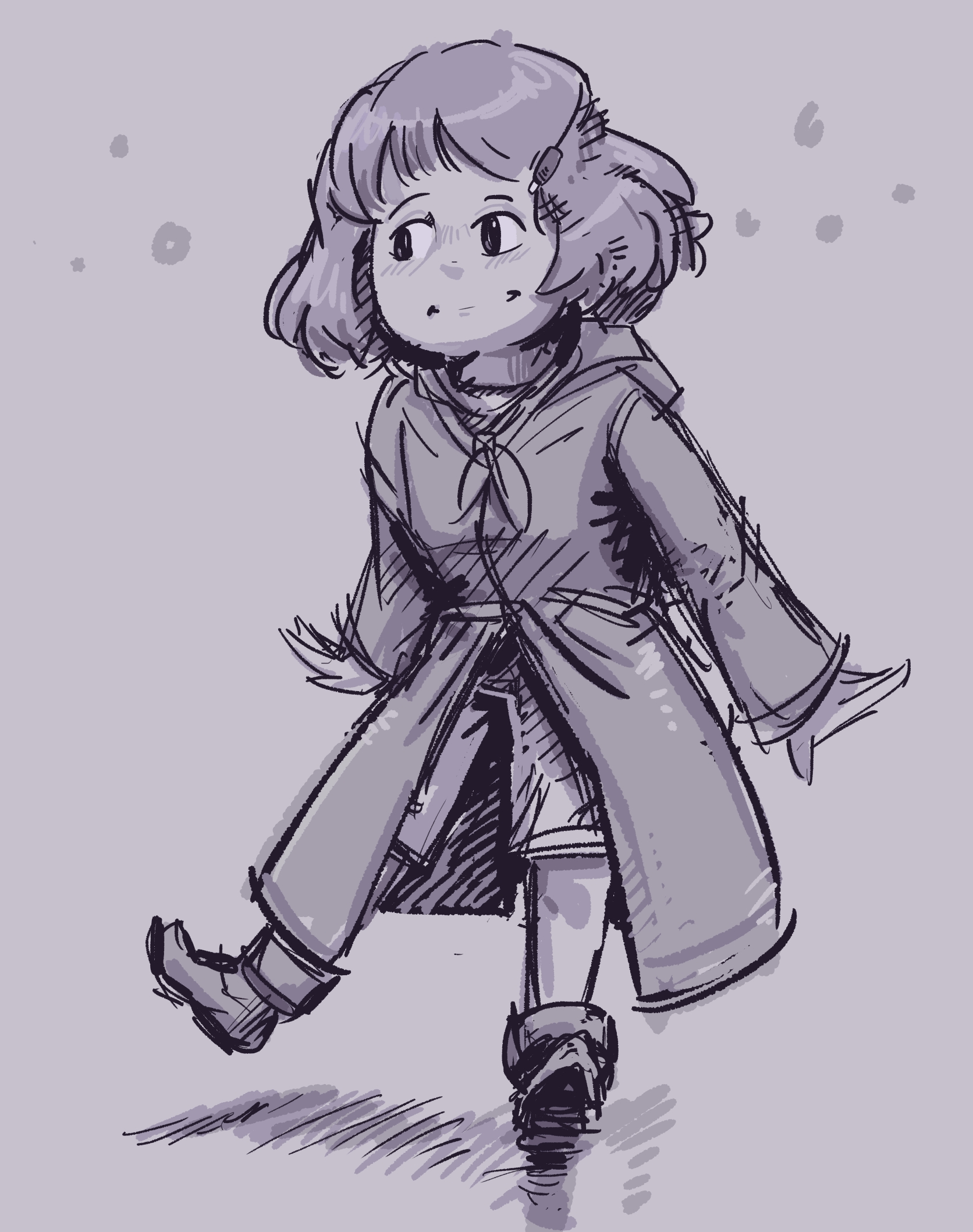 She is a young girl with brown eyes[1] and chestnut brown hair and wears a simply navy blue and dark, child’s hat[2] that has a wrinkle near the tip,[3] and a little star made of thin wood and painted silver, on top.[2]