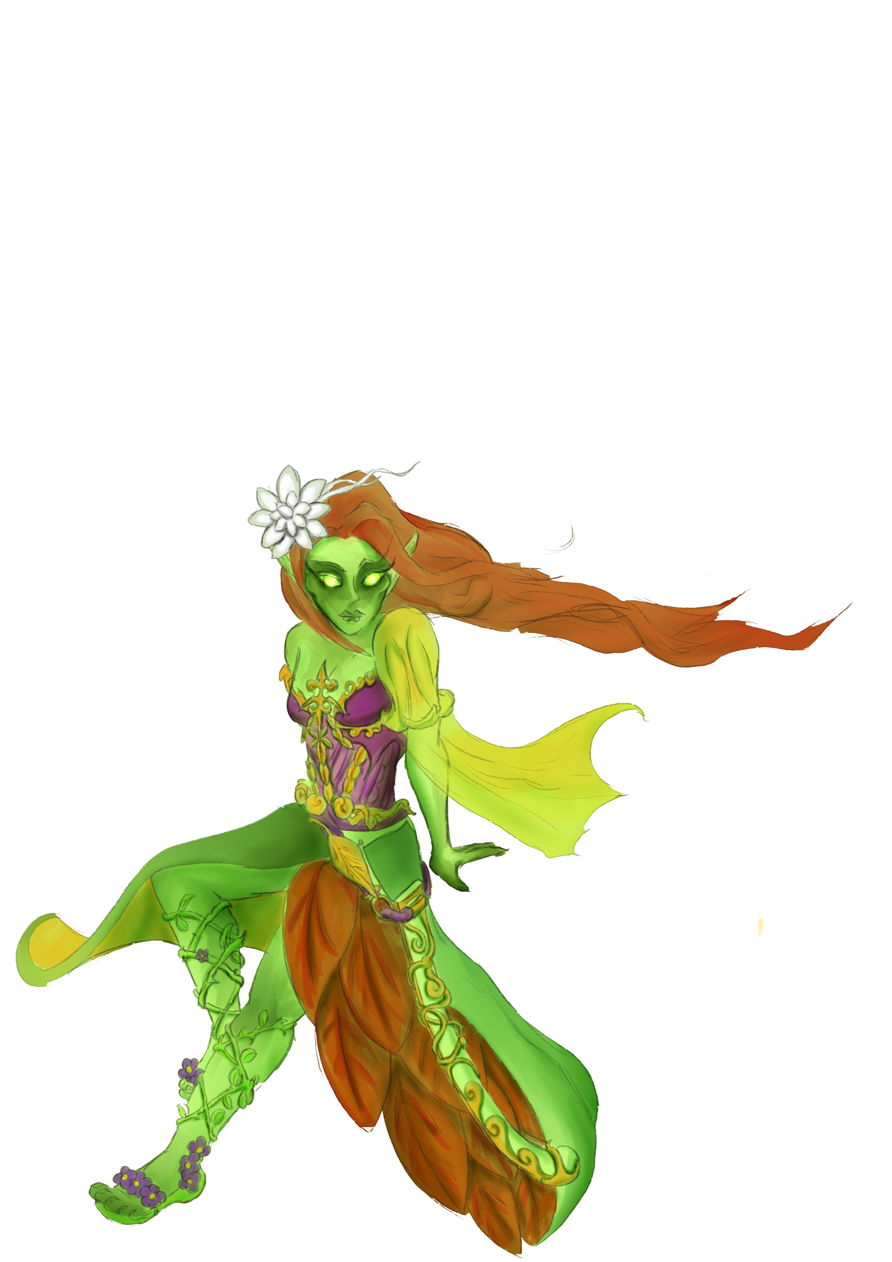 Shaestrel's true appearance is that of an imposing lady of the Spring Court, with auburn hair, green pupils - like "constellations" - and black sclera. She wears a white flower of mourning in her hair, and her sandals are laced with grass and flowers from the lands of the fae.