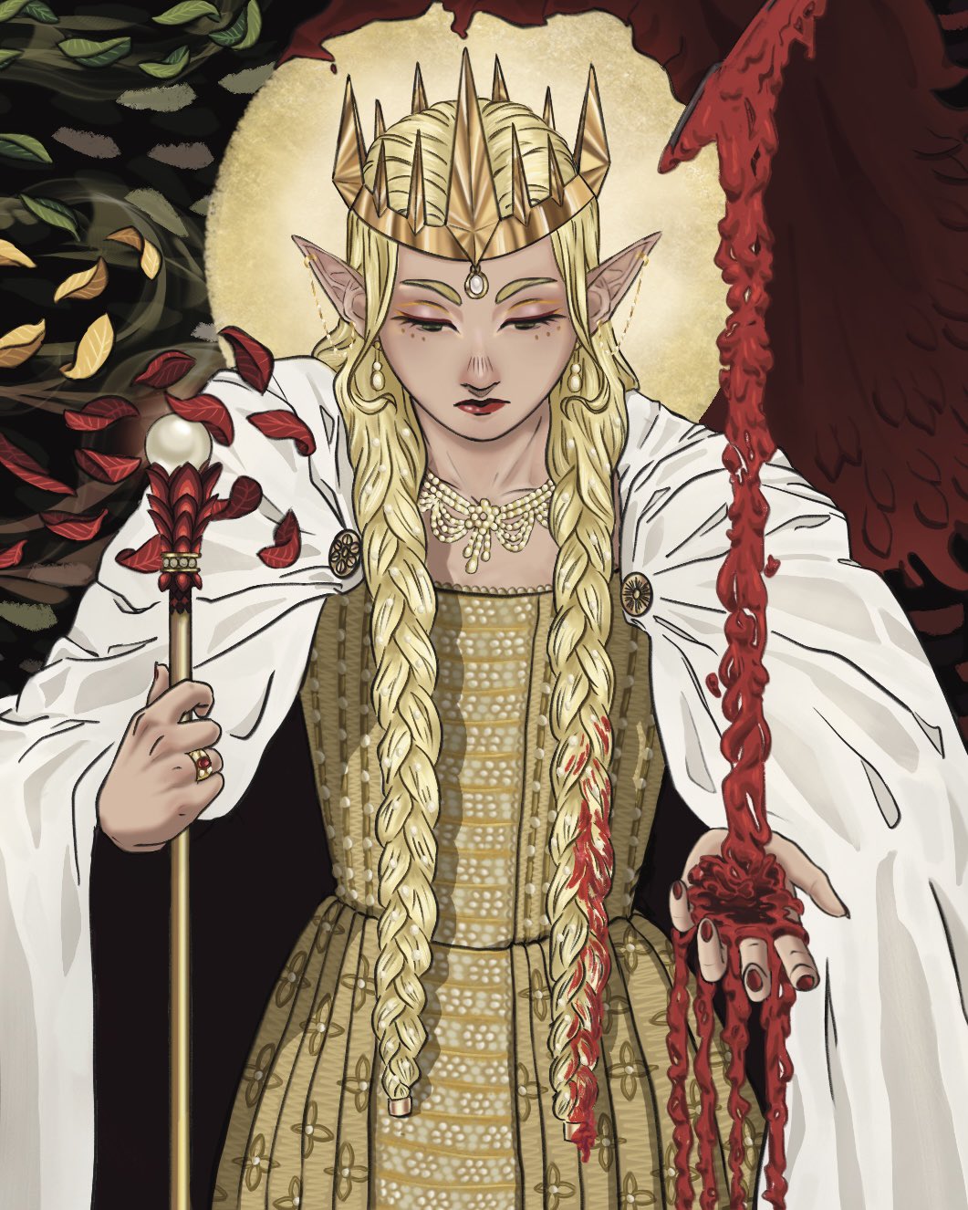 During the War of the Gods, Sprigaena fought on the side of the Gods and their Grand Design. She has shed the blood of other gods and every race that existed at the time except for one (likely Goblins). After the War, she ruled as a queen over much of Terandria, married a Human,[2] and hunted down those that had sided against them, such as the Gnomes.