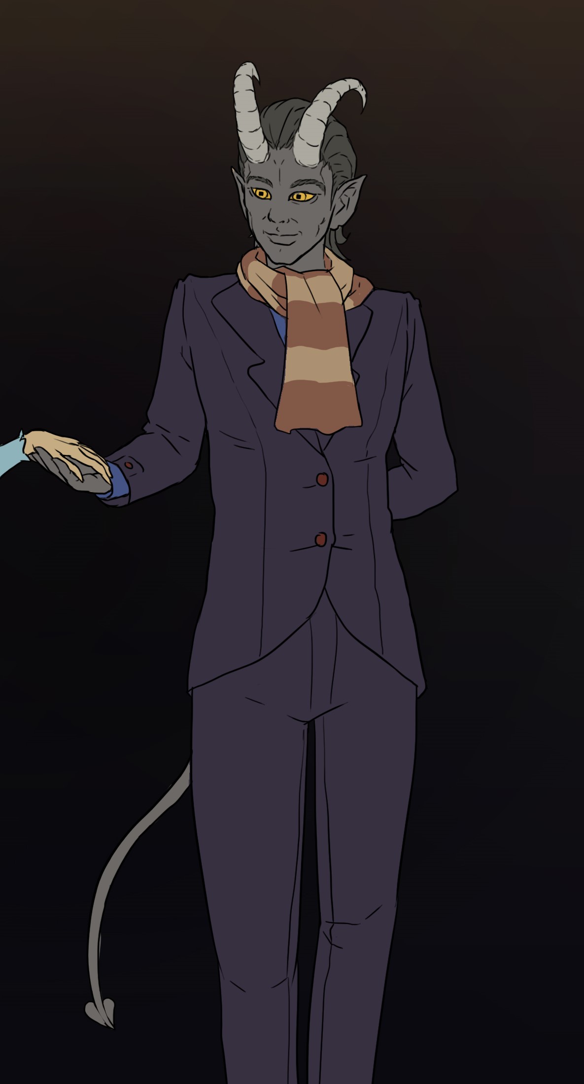 He is a tall man. With his glamour, he resembles a meticulously dressed human with slightly dark skin, jet black hair tinted slightly blue, bloodless lips, and bright orange yellow eyes. His real appearance has gray skin, tall horns curving up, sharp teeth, and a tail.[1]