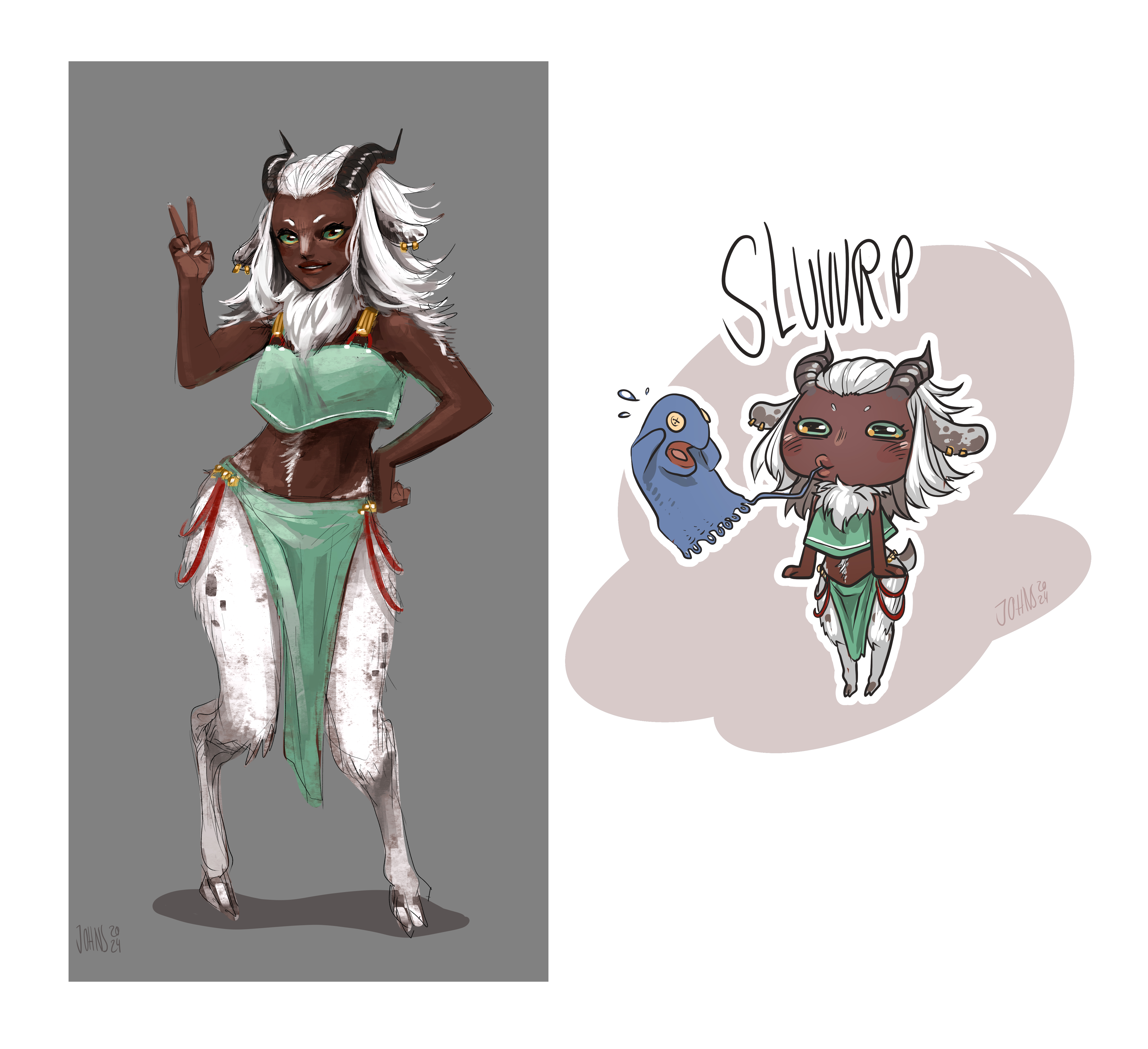 She has the appearance of a Satyr, with goat horns and furry legs with hooves. Her eyes are green, while her fingers are similar to a Human's, albeit furrier.