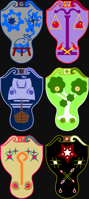 Coats of Arms in tower shield format for the six Walled Cities, by Enyavar