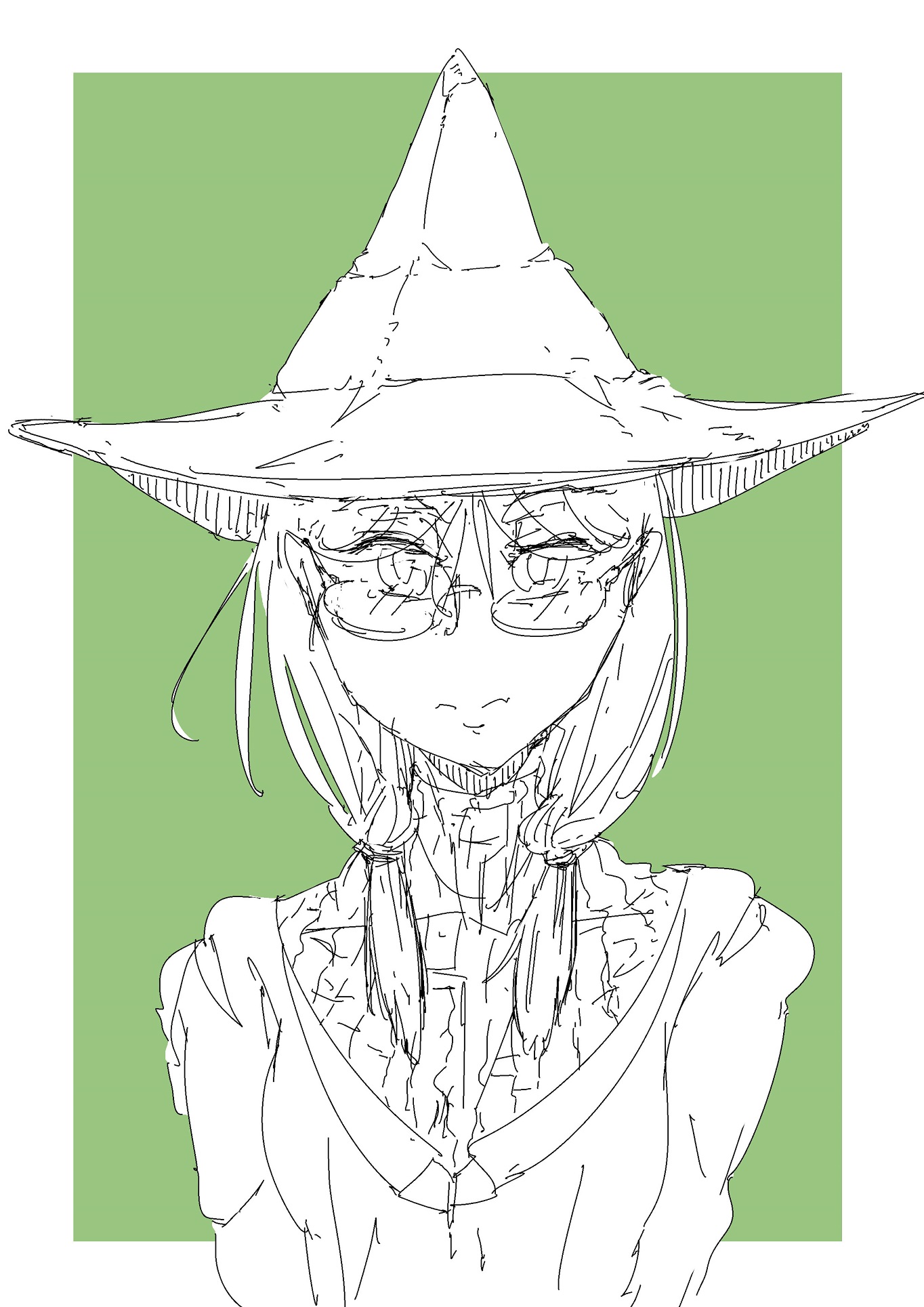 She is a young woman with dark hair, closer to black, but the faintest bit blue at the roots,[2] and yellowish green eyes.[3] She wears glasses,[4] a simple and ordinary blue robes that are more like dark cobalt, and a pointed hat is the same color. For footwear she wears decent work-boots.[2] She has handprint-shaped burns on her arms.[5]