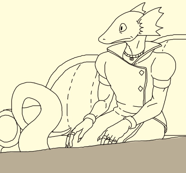 He is at least nine feet tall, with glittering gold and red scales that run from his long and powerful tail, up into his humanoid torso, two arms and serpentine head. He has long fins on the back of his head, like a Lizardperson’s frills, and bejeweled fingers.